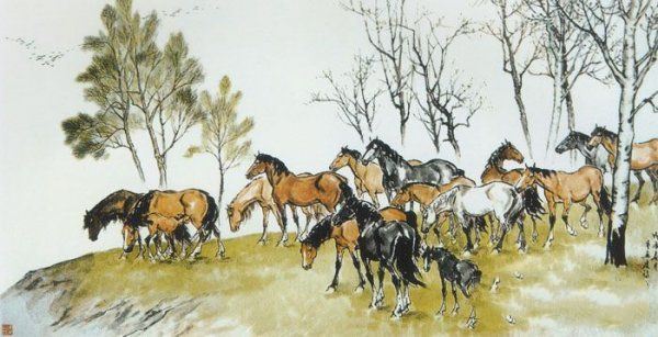 尹瘦石《晓林放牧》:尹瘦石先生是中国著名书画艺术家,金石、书法、山水、花鸟、人物,无所不精,无所不能,尤善画马。此作为他的代表作品之一,作品描绘清晨群马被放牧的情景。从作品的笔墨、造型、意境、构图等方面都显示出画家的深厚修养和扎实的功力,都浸染着时代的印痕,有着鲜明的时代特色。因此可以说,尹瘦石的艺术既是个人的风格再现,也反映出特定时代的审美追求。
