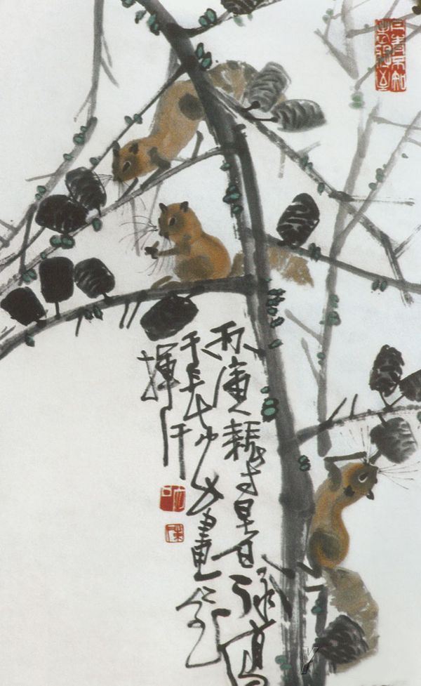 陈笳咏《松鼠》:陈笳咏先生是中国著名美术理论家、书画家。此作是他的传世代表作品之一,作品描绘的是几只松鼠觅食的场景,画家以饶有趣味的笔墨描绘松鼠,造型稚拙可爱,笔法灵活松动,用墨熟练自如,只施以浅淡的颜色。整个画面充满了童趣,其构图、造型、用笔、用墨,设色都处理得恰到好处。落款的位置也安排得十分巧妙,用印的位置更独具匠心。