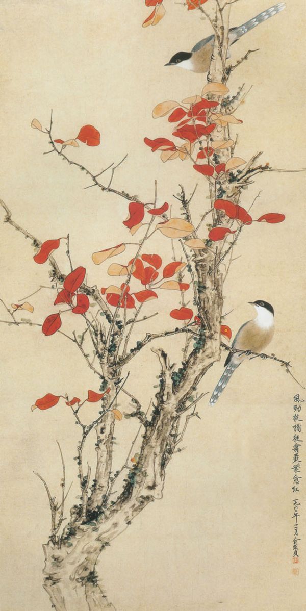 俞致贞《霜严叶愈红》:此作颇有宋人法度,构思巧妙,章法严谨,造型生动。画家描绘了秋天的红叶与小鸟,绘画技法娴熟,设色艳丽。图中几十片红叶或正、或反。或掩映、或卷曲,在造型上绝无雷同造作;小鸟羽毛丰润,神形俱佳,伫枝回首,生动可爱。鸟的颜色与红叶在色彩上形成了对比,使画面丰富,主题鲜明。此图在写实基础上再现了“风劲枝犹挺,霜严叶愈红”的深秋景色,给观者以耳目一新之感。