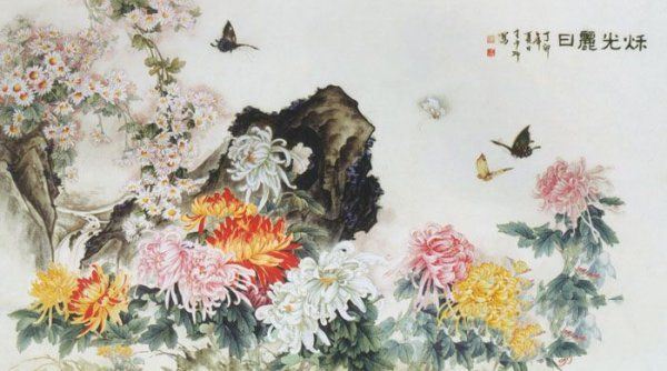 王少卿《秋光丽日》:此作为王少卿先生的工笔花鸟之作,以秋菊为题材。图中,秀石旁,菊花怒放,顾盼生姿,千娇百媚、形态各异;彩蝶翩翩飞舞于花丛中,使画面显现得更加艳丽璀璨。画家重视写生,有极强的写生能力;画家重视传统,具有深厚的笔墨功力。因此,在此幅作品中,画家能把秋菊哗然秀发、傲睨风霜的自然特点表现得宛若天成。