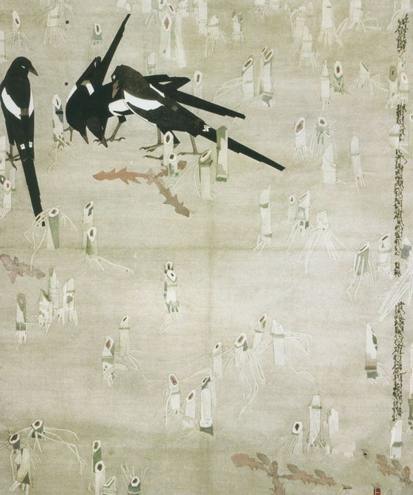 贾平西《秋思》:贾平西先生的这件作品描绘的是北方收割过的高粱地里的场景。图中收割过的高粱地里林立着一茬茬的根子,几只喜鹊正在地中觅食。此情此景在北方随处可见,但真正把它融入到绘画艺术中的贾平西先生可算是第一人。他将这一富有乡土气息的题材,经过艺术加工和提炼,展现出一幅充满乡情的美丽画卷。画家以简洁的造型,淡雅的设色,装饰性的笔法,使画面妙趣横生,意味深长。