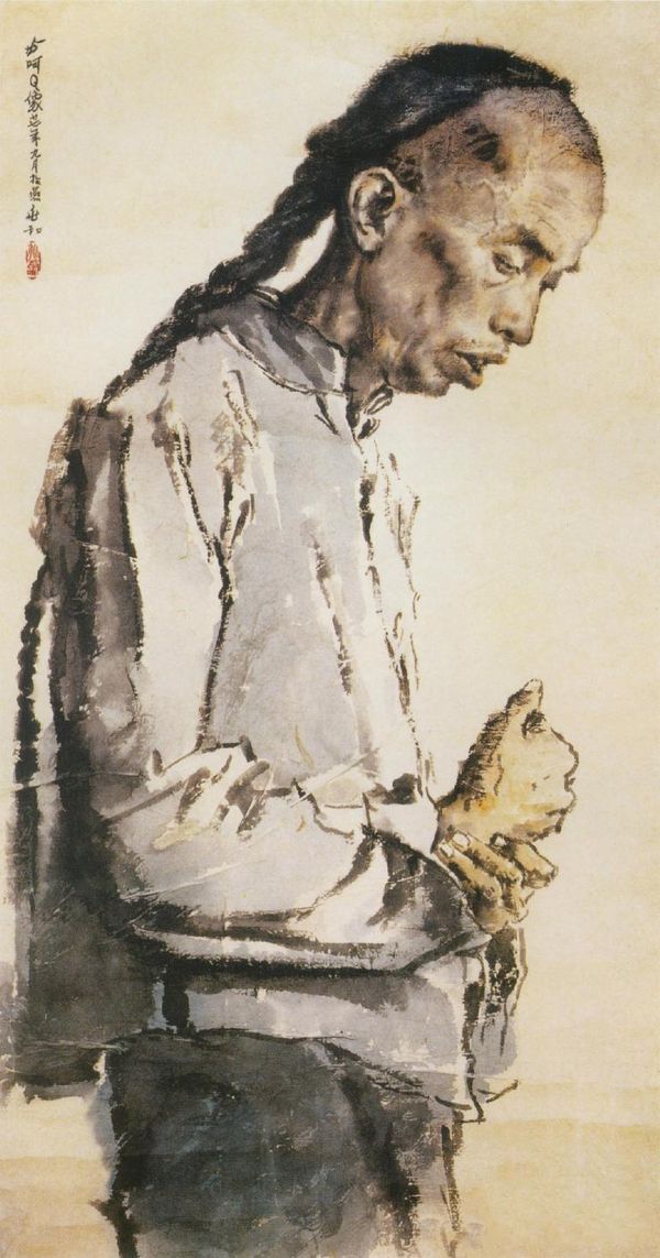 蒋兆和《与阿Q像》作品介绍:纸本,设色;纵97厘米,横52厘米;作于1938年;藏于画家家属。