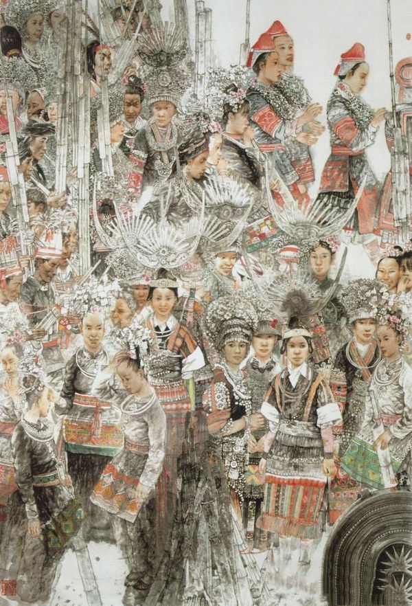 李乃宙《苗岭三月》:李乃宙先生的这件作品是一幅具有民族特色的,场面宏大,震撼人心的巨幅画像。这样的巨幅人物画在近年画坛上是比较少见的,由此也反映出了画家娴熟的造型能力和对巨大场面较强的把握力。作品中画家充分展示了自己的长处,在构图上反复推敲,使作品既密不透风又疏可走马,画面中恰到好处的留白让人感到不闷不塞。画家吸取了永乐宫壁画的构图模式,一丝不苟地刻画了几十个人物形象,以健康秀美的苗家少女的华丽造型把苗岭三月具有浓郁民族特色的繁荣景象表现了出来。