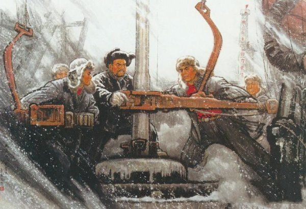 赵志田《石油工人无冬天》:赵志田先生的这件作品是一件反映时代精神风貌的作品。作品中铁人王进喜带领下的大庆工人正在严冬的暴风雪中忘我的劳动,这是大庆精神的体现。作品的笔墨服从于人物形象的刻画,人物形象服从于主题表现。这种创作风格,是那个时代的要求,反映出当时笔墨趣味同大众习俗相关联的创作模式,显现出作者艺术精神的朴实。这是在中国绘画从古典形态走向观代形态过程中的一个历史性的环节,也是特定时代的审美需求。