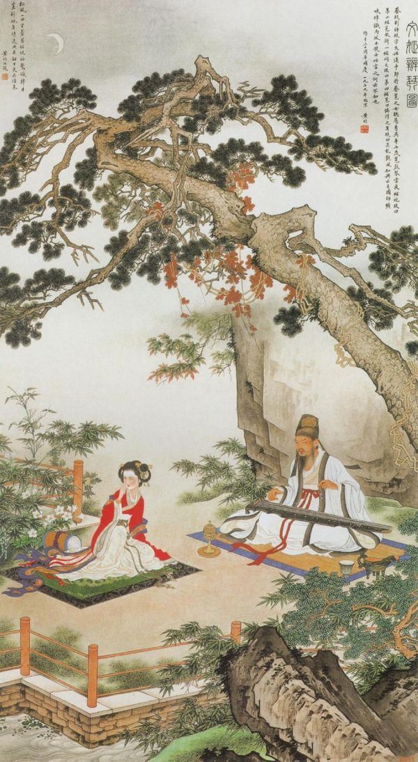 黄均《文姬辨琴图》:蔡文姬是东汉末年大文学家蔡邕的女儿,是中国历史上著名的才女和文学家,精于天文数理,既博学能文,又善诗赋,兼长辩才与音律。相传蔡文姬自幼聪慧,7岁时就能听出其父弹琴时哪根琴弦绷断,哪里弹错音节。黄均先生的这件作品描绘的便是蔡文姬听父弹琴的场景。作品中小文姬天真可爱,而蔡邕在吃惊之余,正为自己有这样聪明的女儿而感到欣慰。图中弯月高悬,环境优雅,给他们父女之间的勾通创造了理想的佳境。人物表情、姿态联系紧密,尤其蔡邕手执断弦这一呆滞的样子更强化了主题,使人物表面的刻画直入内心,上升到一个新的艺术高度。