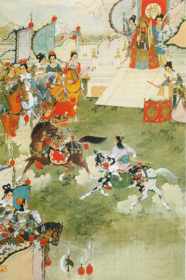 任率英《杨门女将》:《杨家将》的故事家喻户晓,穆桂英挂帅更是广为人知,此作描绘的是战前穆桂英与其子杨文广比武的一段情节。图中众姐妹英姿飒爽,精神抖擞,画家描绘刀马人物的专长由此可见一斑。此图场面宏大,旗幡飘扬,佘老太君执令旗亲自督战,阶前绿荫覆地,映衬出画面的多姿多彩。景物描绘工整细致,人物形象神采飞扬,衣纹盔甲威武雄壮,色调艳丽隽秀,人物众多,各具个性,充分显示出作者工笔重彩人物画的精深造诣及绚丽雅艳的艺术风格。