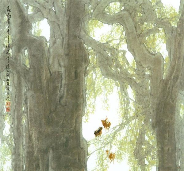 杜应强《春雨蒙蒙》:杜应强先生自幼酷爱绘画,擅长版画、国画和速写,画风浑厚、朴实、清丽、明快、富于诗情与乡土气息。他的作品大多以古榕树为题材,他解决了古榕树纵横交错树干交叉的空间感和层次感,另外他还汲取西画的种种表现技法,创造了独特的绘画语言。这件作品中他用阔笔画出大树粗壮伟岸的气势,用散锋密点画出繁茂的树叶与之形成强烈的对比,几只小鸟活跃在树丛中,创造出让人神往的淡泊、宁静、超逸的意境,充分体现了杜应强绘画的艺术特色。