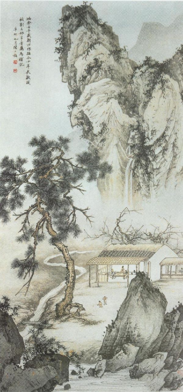 陈少梅《岁朝图》:此作描绘的是中国民间传统的年终贺岁的场景,作品中远处 岩巍峨,陡峭险峻,林木葱郁,一条瀑布迂回曲折而下,汇于山下形成一条弯弯的小溪;近处两块巨岩突兀而立,既是构图的需要,也使全图产生空间距离感。一棵虬曲挺拔的古松下有两小儿正在燃放烟花,后面一屋有三人正在用饭,屋内颇具情节性。一仆人正端菜伺侯,屋中主人坐正位,两客侧坐,正吃得津津有味。此图是典型的节庆风俗画,虽是近人所为,但古意盎然,奇趣横生,人物关系和穿着符合过去习惯,由此也可窥见画家传统艺术造诣的确非同寻常。