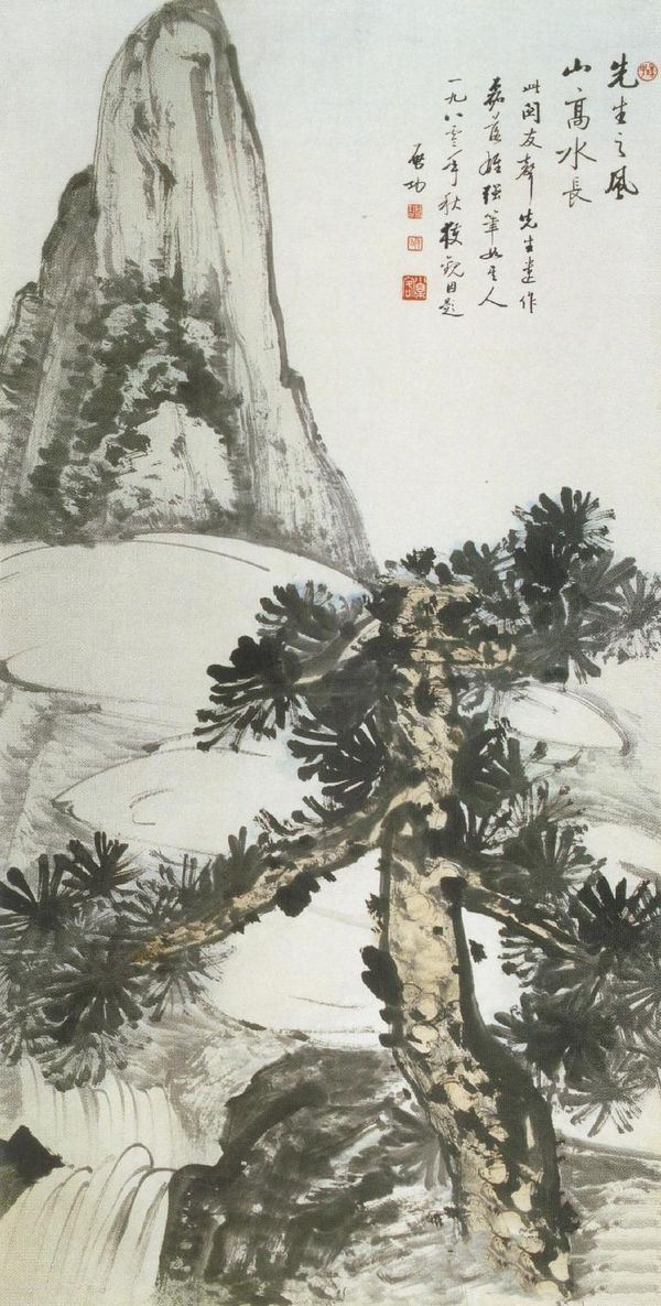 关友声《山高水长》:这件作品是关友声先生的得意之作,作品绘松树,山石,瀑布之景。松树姿态奇特,笔墨苍劲刚强,山形势厚博大,云水游动其间。意在笔先、情深意长,诗情画意游溢于其间,能在湿笔中取其气,枯笔中取其润,使画面有一种凸现出来的感觉。作品上面的落款为他的好友启功先生所作:“先生之风,山高水长”。