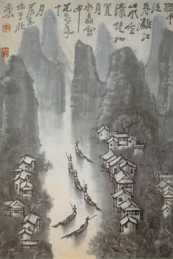 李可染《雨中漓江》:漓江是广西桂林著名的旅游胜地。古有桂林山水甲天下之说。李可染先生极力提倡师法自然,注重直面现实,落墨写生,因而其山水画具有从大自然中得到的新鲜感和具体性,突破了山水程式的僵化趋势,为山水画复兴注入了新鲜血液,给人以直观生动的感受。这件作品中,漓江沐浴在雨水之中,远山的迷蒙,是以模糊的抽象形体简率地表现出来,而竹楼、渔舟则以浓墨醒笔点出,形成强烈的视觉对比。用笔的力度和用墨的韵味为了得到充分的展示,湿笔笔线的书法性隐含在其形象特征背后,以使笔墨的独立性凸现出来。画题旨在“漓江”,不见一波,旨在“雨中”,不着一墨,但烟雨朦胧的感觉使漓江山水顿时跃然纸上。