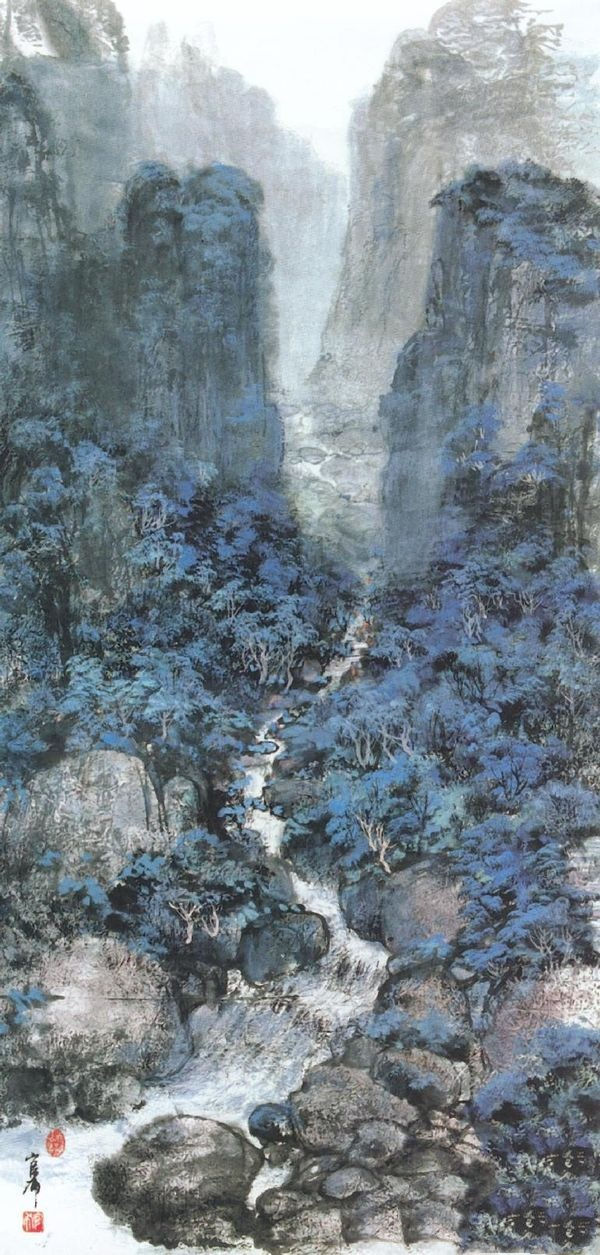 官布《翠谷烟云》作品介绍:纸本,设色;纵137厘米,横66厘米;作于1984年;藏于画家自藏。