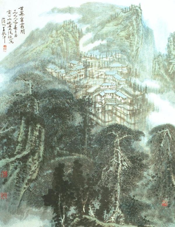 王振中《苗寨云雾间》作品介绍:纸本,设色;纵102厘米,横88厘米;作于1999年;藏于香港《收藏家》。