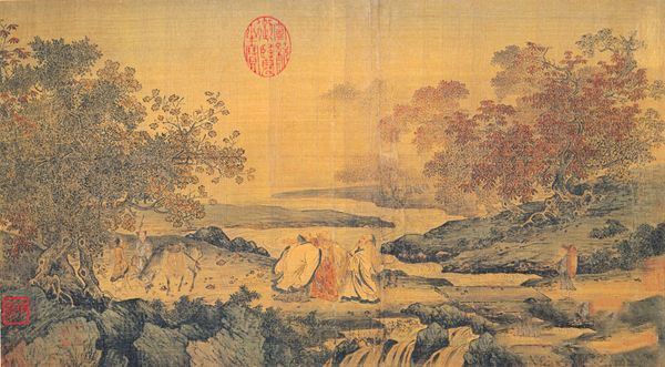 《虎溪三笑图》作品介绍:绢本,册页,设色,青绿;纵26.4 厘米,横47.6厘米;藏于中国台北故宫博物院。