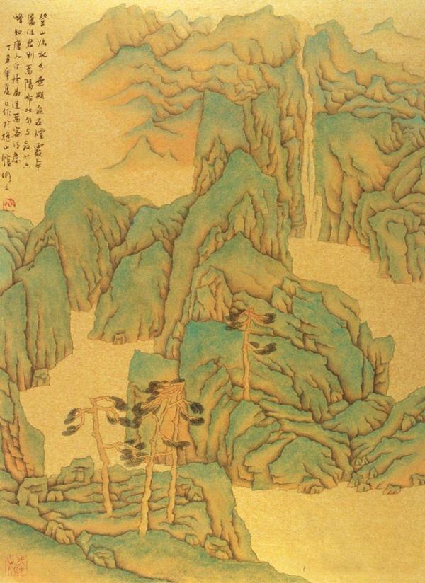 李明久《登山临水》:李明久显示的作品被人评为:“质含古意而文变今情”。这件作品是其中一件代表之作。作品中山石以线组成结构,山头以石绿着色渲染,山石的前后左右相互穿插,营造出深远的空间,循着这一空间把观者带到一个古寂而悠远的超现实的幻境。