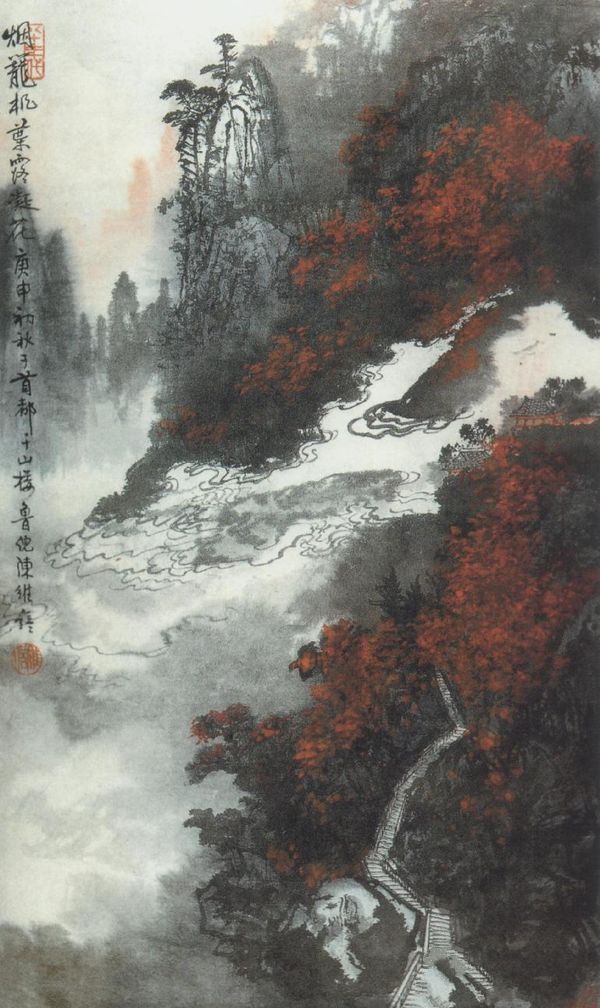 陈维信《烟笼枫叶露凝花》:陈维信先生生于1918年,卒于1990年,笔名陈实,堂号千山楼。他的国画山水作品以秀雅润泽见长,特别是表现烟笼云山,苍苍茫茫的自然风光更能得天真之趣。这件《烟笼枫叶露凝花》是他的代表作品之一,是一幅诗情画意相结合的国画精品。取山崖胜境一角,远处山峦朦胧可见,峰峦如聚,近处古寺只露一顶,没于茫茫林海之中,山腰云气溟朦,烟雾迷漫,一条曲折的石板小路通向古寺,更增加了山势的险峻。此图以墨线打底,水墨交融,一股淫淫湿润之气自画面而出,别开生面,然后以红色点染积成枫叶,顿时群山神采备生,独具一格。