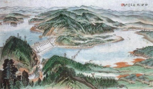 陆俨少《珠石冲哨口》:陆俨少先生是中国当代画坛的山水艺术大师,与李可染先生一起被誉为“北李南陆”。陆俨少先生的山水画中独创了两种新技法,一是“留白”,二是“墨块”。所谓“留白”就是以水墨留出白痕,这种白痕在陆先生的作品种多数用来表现云雾,也可以被看成泉水、山径和浪花。留白要以墨色反衬,所以陆先生又创“墨块”法,以浓墨积点成块。陆先生还擅长用长线条描水勾云,他的水纹描绘写尽了江波万态。他的勾云是以较细的拖笔中锋画云的阳面,以较淡而毛的环曲线条勾云的阴面。这件作品是他的代表作品,描绘的是革命圣地井岗山珠砂冲哨口的全景。陆俨少尤善描绘这种全景山水,他以凝重浑厚的线条和丰富多变的笔法描绘了山川激流、云绕峡谷的景色,章法奇趣,气势宏大,别开自古未有之生面,生动地表现了自然界中的云气蒸腾、江水汹涌、林木苍茫的景象。全幅画气韵生动,格调清新,墨色明快,以一种恢宏磅礴的气势,形成巨大的感染力,令人神往。