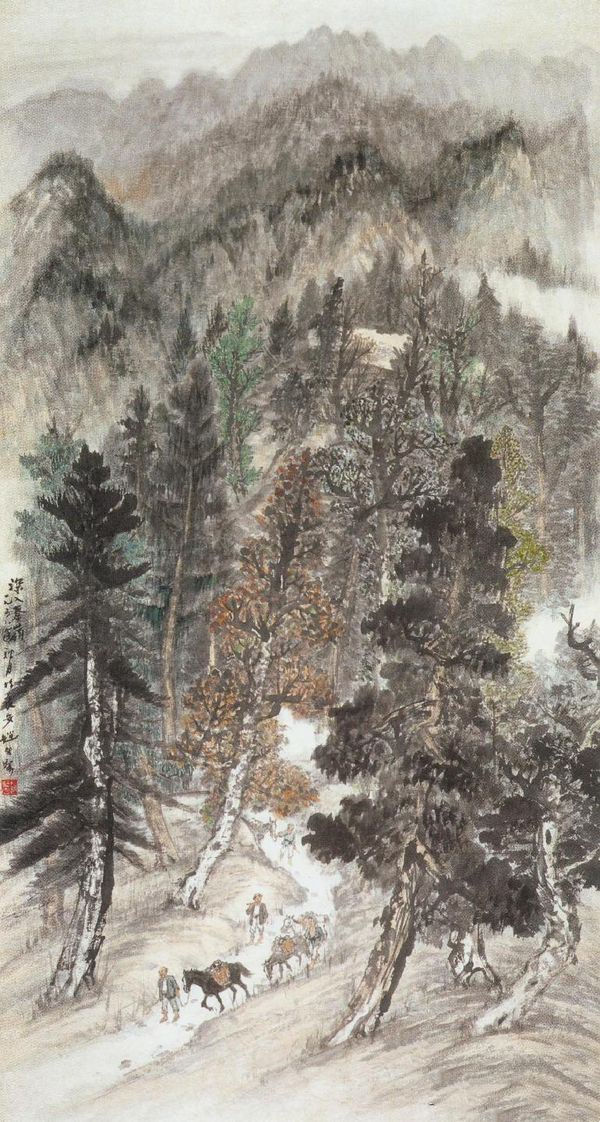 赵望云《深入秦岭》作品介绍:纸本,设色;纵167厘米,横87厘米;作于1958年;藏于画家家属。