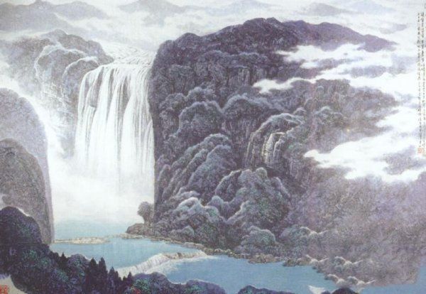 李问汉《瀑声十里》: 李问汉先生的这件作品描绘的是中国著名的瀑布——贵州黄果树瀑布。他曾两度赴贵州黄果树瀑布写生,为瀑布之壮观所震撼,为了寻找最能表现黄果树瀑布之壮丽和气魄,曾不择路径在石壁与树丛中攀登、观察、写生,从自己的观察中选择最有表现力的角度,以表现自我感受。此作曾参加了中、日、韩三国的美术作品展览,深受国内外艺术家的好评。