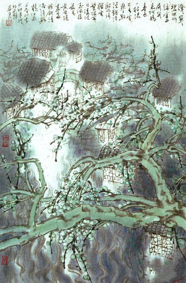 孙君良《横斜清浅傍溪桥》:孙君良先生是中国著名的国画家,他自幼喜爱国画,无师自学成才。他的作品以苏州园林和江南山水风光为主,具有吴派清新典雅之风和鲜明个性特色。这件作品描绘的便是江南之景,江南太湖之滨多梅林,洞庭西山及光福邓尉山等处皆有大片梅林,早春时节,雪香云蔚,香闻十里,素有“香雪海”之谓,且与江南山村水廓相映,为江南农村特有之境界。此画以老梅横斜与溪桥老屋相掩映,墨色相融.渲染秀润,很好地表现了暗香浮动、疏影横斜的意境。