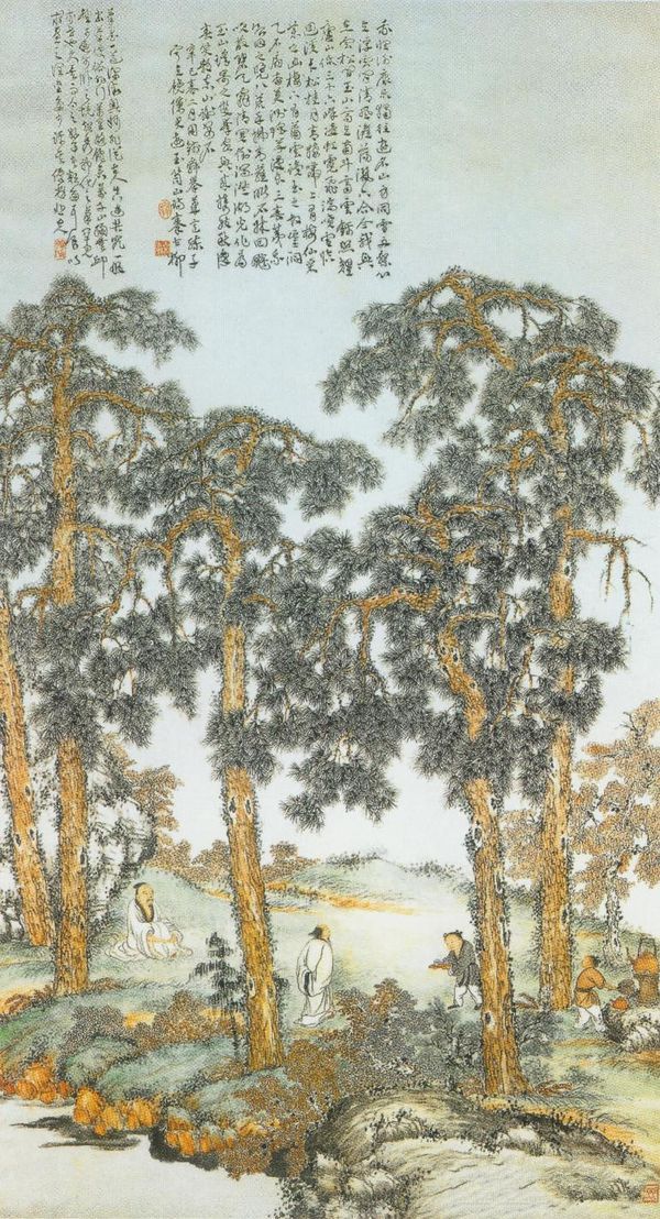 秦古柳《松下吟诗图》:秦古柳先生的这件作品是一件寓意性极强的作品,通过松树在传统文化中的意义来寓意高洁之意。作品中以松树为主体,五株松树郁郁葱葱,耸入云霄,松树聚散疏密,布置得当,枝干针叶向背俯仰,参差高下,统一中求多样,平中求奇。在造型上可谓“拆开则逐物有致,合拢则通体联络”,表现了画家对取物象神韵的艺术概括能力及经营布局的匠心独运。河畔林下一片繁密草地上,有背手行吟者,有端坐沉思者,而侍童一个打扇煮茶,一个托盘送茶。在一片静谧之地,既有自然的静,又有人物的动,人物与林木穿插构成灵动的意境,松林、坡岸、草木均用复笔积染,似不轻意,实则功力深厚。