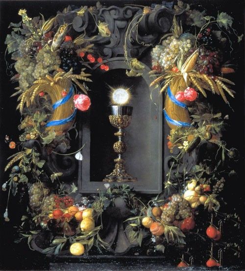 希姆《水果花圈》作品介绍:外文名Eucharist in Fruit Wreath;画布,油彩Oil on canvas;纵138厘米,横125.5厘米;作于1648年;藏于奥地利维也纳艺术史博物馆 Kunsthistorisches Museum, Vienna。