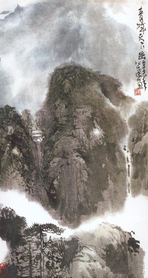 郭公达《青城天下幽》:郭公达先生生于1931年,安微人,毕业于浙江美术学院中国画系,任教于安徽艺术学院,一级美术师,现为安徽美术家协会副主席。中国美术家协会会员。他的作品能表现江南溪谷的俊逸清幽,又能表现北国山水的雄浑壮阔。青城山,古名“天仓山”,又名“丈人山”,是中国道教发源地之一,属道教名山。郭公达的这件作品描绘的便是青城山的风景。作品气韵生动,水墨淋漓,墨中见笔,构图新奇。画面主峰墨彩浑厚,远山轻妆淡抹。山涧小溪潺潺而下,山间树丛中隐约可见的小屋,凭添了几分青城天下幽的感觉。画家此幅作品收放自如,在大块的泼墨泼彩中结合老到的山石皴法,极得青城山的云水浮峦之趣,清幽和穆之妙,充分显示出画家深厚的山水画功力。