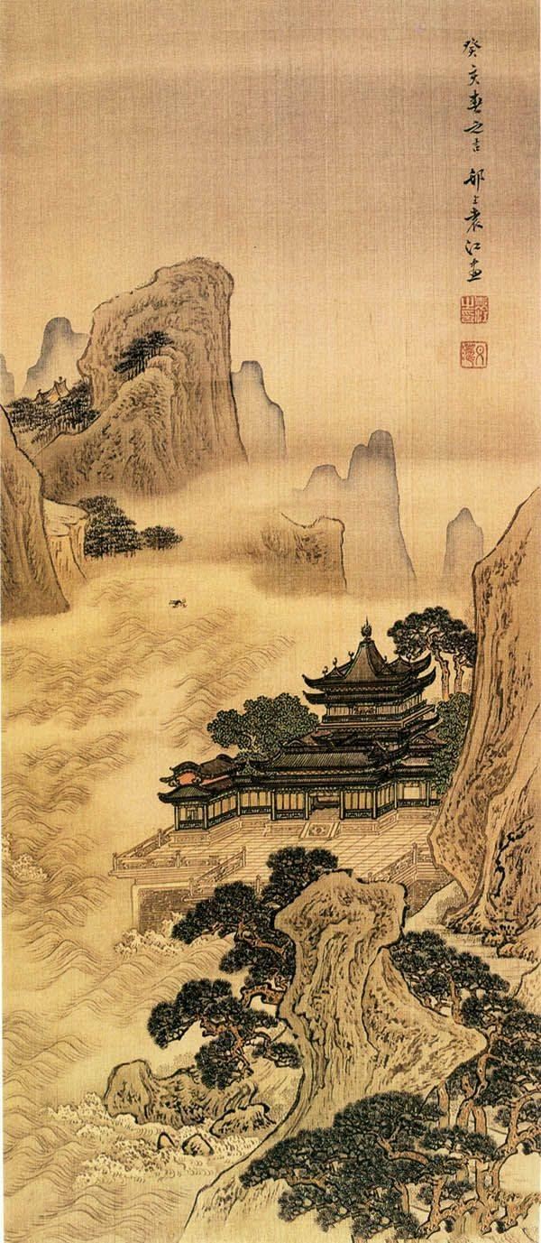 袁江《海屋沾筹图》:这件作品是袁江山水组画之一。松绕危岩,海涛汹涌。崖壁下,平坛楼阁,稳坐拍浪之间,波连薄霭横云,远山叠翠,峰峦起伏,气势壮观。石壁不加苔点,更感坚硬,楼阁界画,周密严谨,阁左上方云气中有一瑞鸟飞临,这正是该画的画眼。