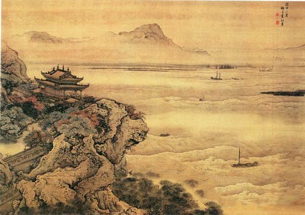袁江《观潮图》简介:绢本,立轴,设色;纵97厘米,横131厘米;藏于北京故宫博物院。