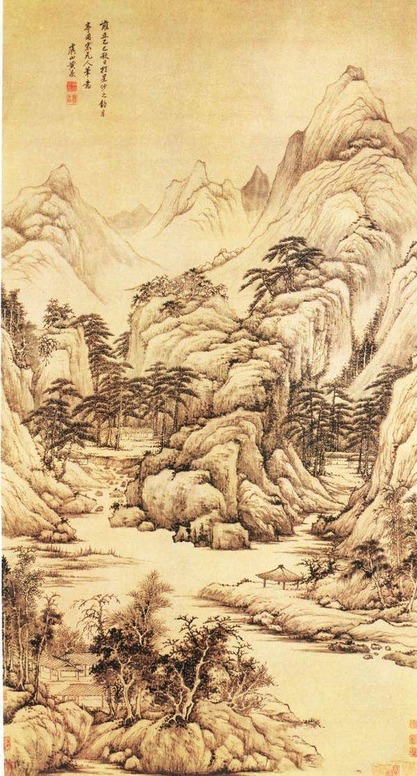 黄鼎《山水图》:在这件作品中山峰层峦叠嶂,密林丛生,山溪汇合,沿溪树林间舍人家掩映其中。布置精心,境界幽旷,笔墨苍劲。