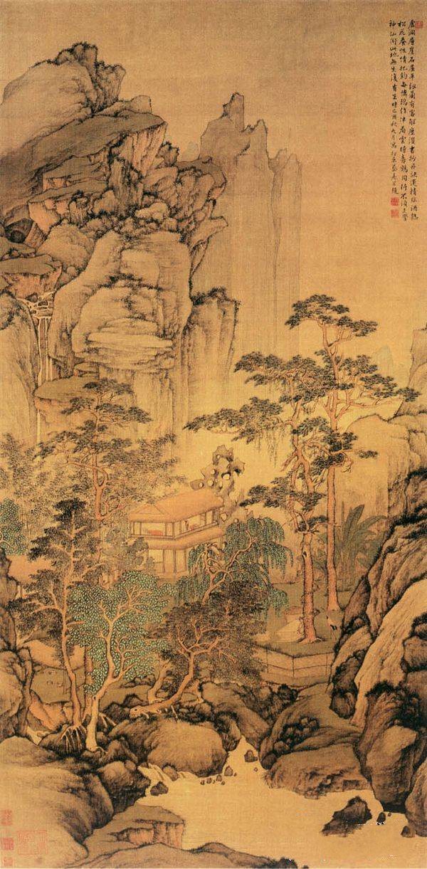 蔡嘉《层岩楼石图》:这件作品是蔡嘉的经典之作,作品造境点景,奇奥幽深,树木茂密,高干轩昂直立,与群树互为掩映,林间楼阁中高士开轩凭栏闲眺,溪流坡石处,灵石与蕉荫下,仙鹤一羽,清润幽雅之情已毕现於画面;而高山并列,奇峰险石,突兀峥嵘,瀑布如银练高悬,益臻声色交加之美。笔墨舒展浓郁,浓淡、疏密、繁简适度。