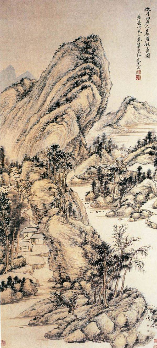 奚冈《岩居秋爽图》简介:纸本,立轴,设色;纵113.5厘米 横48.5厘米;作于1796年;藏于北京故宫博物院。