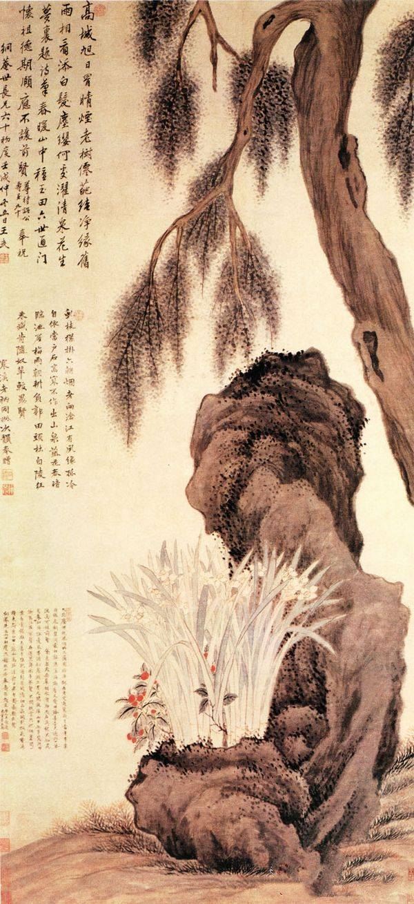 王武《水仙柏石图》:在王武的这件作品中一株柏树自画中央的右边深入,从右上角伸出画外,画上有一耸立的湖石,湖石之上青苔点点,石下一丛水仙盛开。树干及湖石以水墨赭色钩勒皴染而成,石上青苔以浓墨点出,又以淡墨点柏,使山石凝重显得坚实而柏树清韵空潆;以双钩画法写水仙,设色淡雅,与山石形成明暗的对比,更显得水仙鲜嫩娇美。近景以不同层次的淡墨写出坡地,增加画面的空间感。石旁地面小草,随手拈来,似乱却有序。