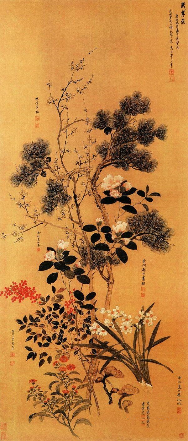 《岁寒图》:这件作品是多位名家共同完成的精品花卉作品,王晕画长春一丛,杨晋写梅,徐玫画山茶,顾防画松,王云写天竹,虞沅画水仙,吴芷画紫芝。真可谓名家云集,珠联璧合。作品多用笔工整、细致,设色妍丽。