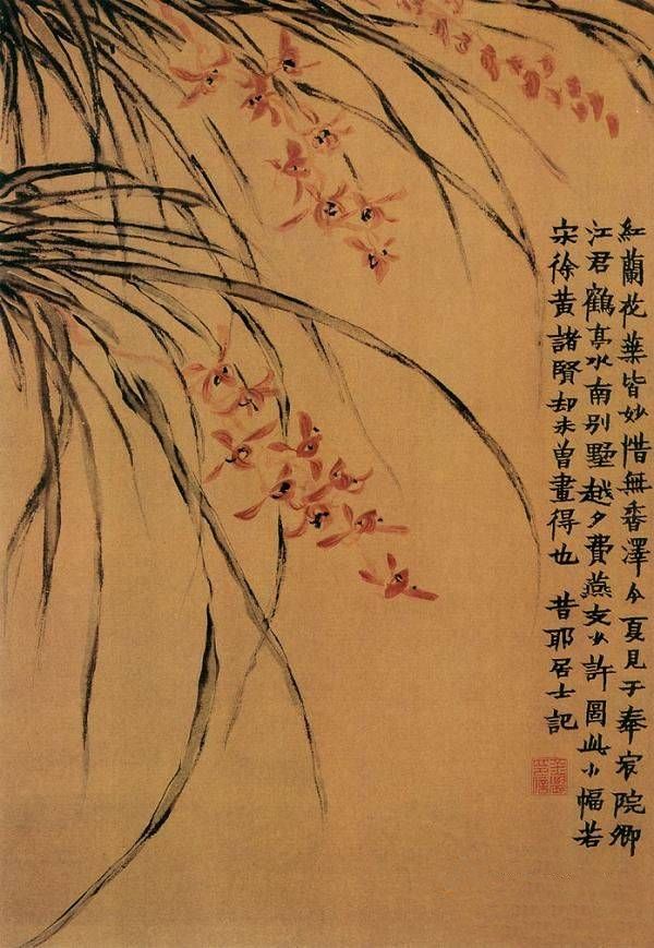 金农《红兰花图》简介:绢本,立轴,设色;纵63.7厘米,横40.5厘米;藏于北京故宫博物院。