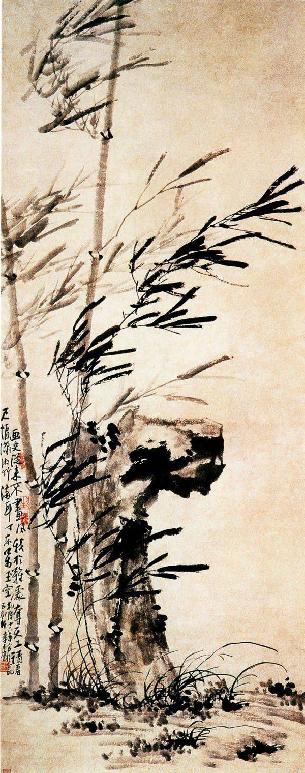 李方膺《潇湘风竹图》:李方膺的这件作品描绘的是雨中的竹石,这是他非常喜欢描绘的题材。作品中竹子和地上的杂草都偏上一边,让观赏者一下就能感受到疾风的狂肆。风是抽象的东西,没有具体的形象,是比较难以表现的,而在这件作品中李方膺却轻松的就表现了出来,可见他描绘技巧的高超。在这里,李方膺不但在描绘技法上显得“因难见巧”,而且显示出竹子不畏强风的精神,笔笔枝叶呈现出坚贞不屈的力量。下笔如风驰雨骤,正象是抒发画家胸中的怒气。李方膺由于仕途生活中得罪权贵,先后下狱罢官,但从不屈服苟且,这幅画可说是他心境的折射。