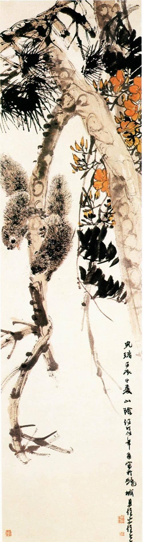 任颐《凌霄松鼠图》:任颐的作品最大的特点是兼工带写、明丽活泼。这件作品基本上都具有这些特点。作品中老松以赭石淡写,以淡墨点写晕染。凌霄花以写意之法勾花点叶。两只松鼠却是以短细的线条,细细绘出皮毛的质感以及明暗的变化,浓墨点睛并留出高光,显得灵动活泼。