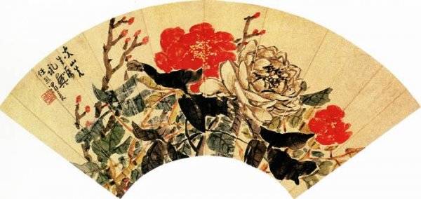 任熊国画作品《花卉图》简介:纸本,扇面,酒金笺,设色;纵19.2厘米,横54.3厘米;藏于浙江省博物馆。