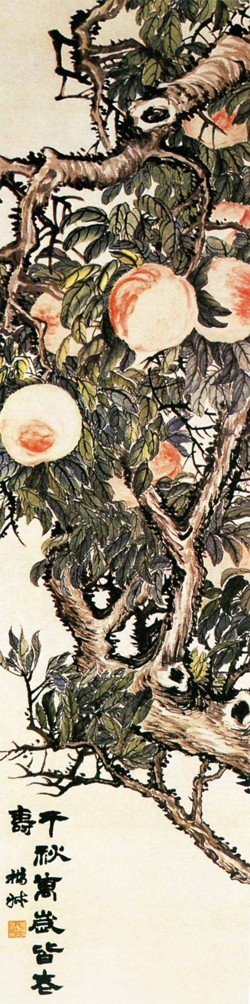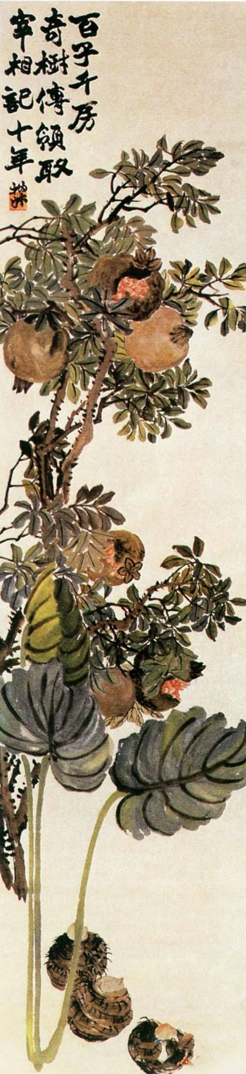 赵之谦《四时果实图》:在清代的画家中,赵之谦可谓是一枝独秀,他的谢意花卉画将文人写意画笔墨技巧与明清兼工带写花乌画的设色原理巧妙地融合起来,极具特色。这件四屏作品是他的代表之作。作品中的花果树木笔墨厚朴,设色浓艳。构图疏密对比强烈,题识书法亦古拙厚重,风格金石气浓郁,个性强烈。这四屏每屏都有他自己的题识,分别是,一屏题:“百子千房奇树传,领取宰相记十年。伪叔。”二屏题:“千秋万岁皆老寿。扔叔。”三屏题:“实花花悬清秋,千金直在中流。伪叔作。”四屏题:“不擎力士拳,且把如来臂。潭禅向天龙,又悟非一指。之谦为紫I甩尊兄大人属画。同治九年十二月。”