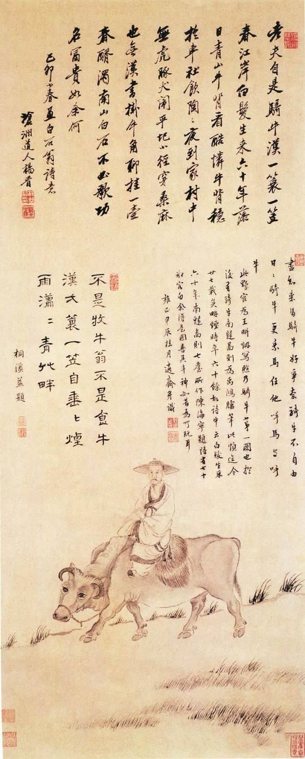 杨晋作品《石谷骑牛图》:杨晋的这件作品和他的另外一件作品《豪门佚乐图》同是他的代表作品。这件作品描绘的是清初“虞山派”创立者即他的师傅王翠。作品中王翠头戴斗笠,身垫蓑衣,骑于牛背之上,缓缓而行,像是雨过天晴之后,徜徉于乡野小径。墨色轻润,渲染有致,勾画简洁,却神韵俱足,充满诗情画意。