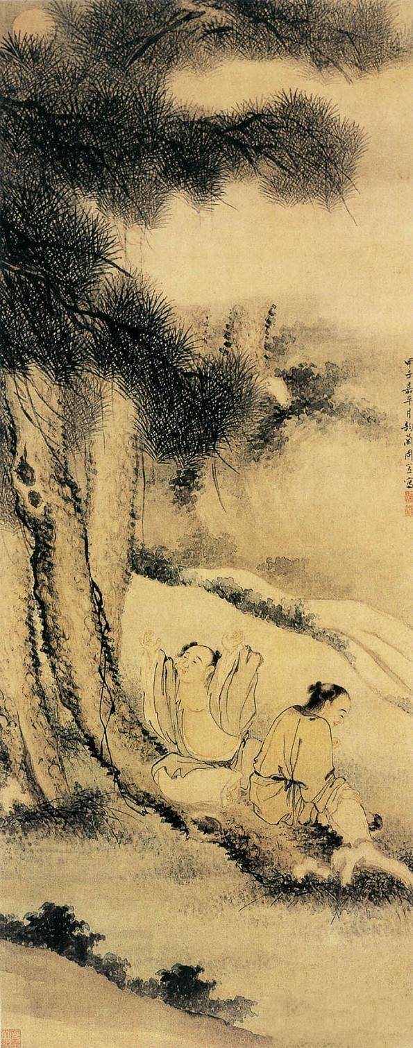 周笠作品《皆大欢喜图》:这件作品是周笠的代表之作,作品描绘的是茂密的松树下,有两位童子,一人弯腰逗鸟雀,一人坦胸露乳,振臂欢呼,仿佛也发现了令人惊喜的事情。人物举止优雅,造型生动活泼。作者以淡渴墨写苍松枝干,浓墨细写松针。用单秒烘染出溪流暮霭,给人以烟雾弥漫,意境深远之感。作品融合恽南田花鸟秀润之笔意,创作出山水、人物合璧之作,自成一家。