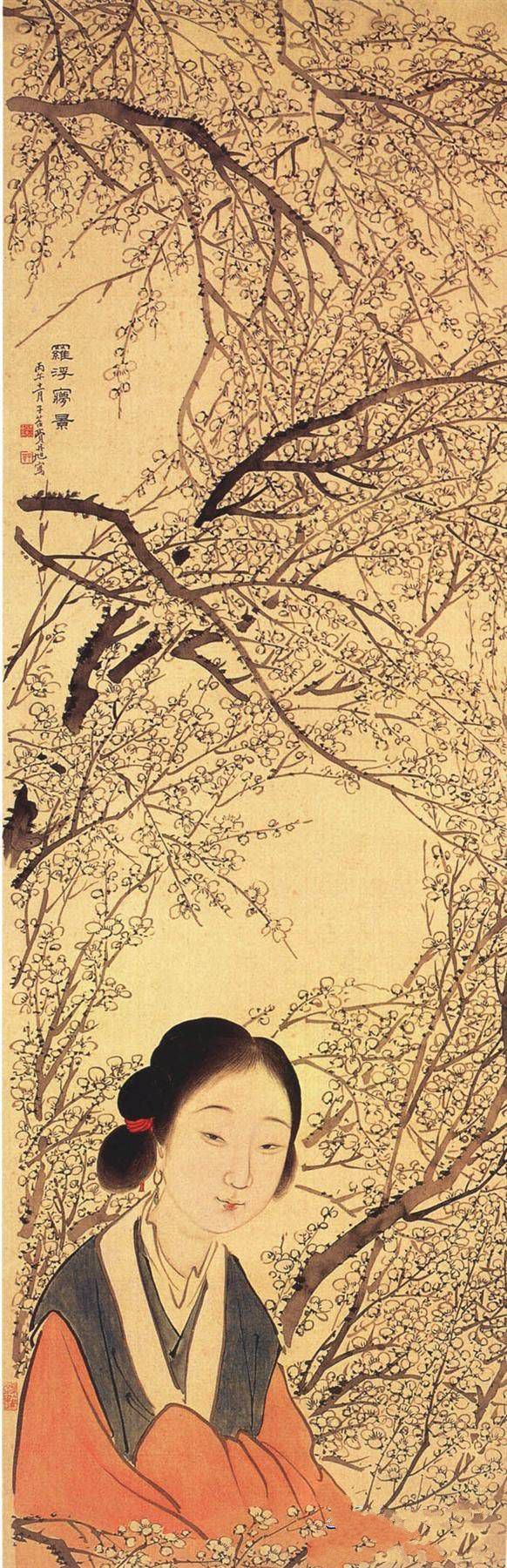 费丹旭作品《罗浮梦景图》:在费丹旭的这件作品中梅花盛开,百花竞艳,百花丛中有一美丽的仕女睇盼有情。作者以纵放的笔意写梅,枝条纷披,曲折纵横,冷葩寒萼,暗香浮动。仕女面容娇俏,具典型的费氏风格,柳眉细眼,脸庞长圆。梅花纯以水墨写成,仕女却设色妍丽,二者相为映衬,产生玄虚梦幻的效果。