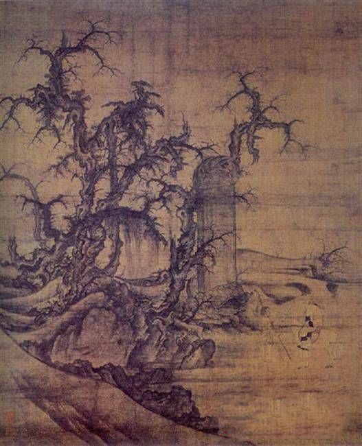 李成作品《《读碑窠石图》简介:绢本,立轴,水墨;纵126.3厘米,横104.9厘米;藏于日本大阪市立美术馆。