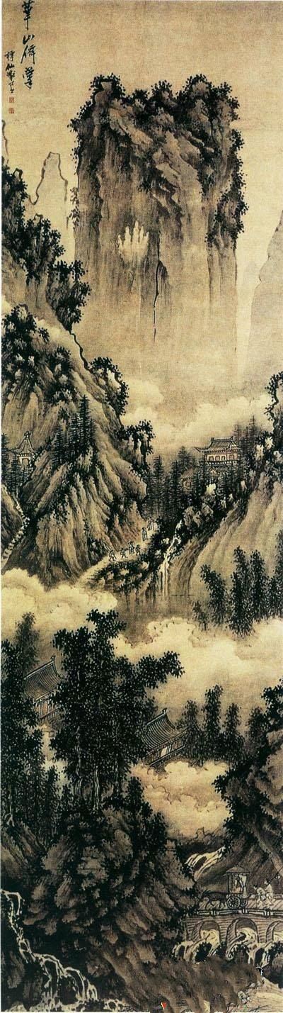 谢时臣《华山仙掌图》简介:纸本,立轴,水墨,淡设色;纵332厘米,横97.5厘米;藏于日本私人。