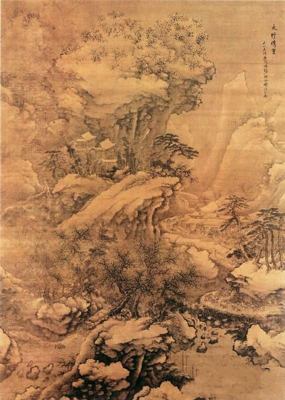 谢时臣《太行晴雪图》:通过作者的题识我们可以知道,这件作品描绘的是太行山上大雪初晴之景。山峰雄健,层峦叠嶂,山峰上杂以大小混点,略加勾勒,显示出积雪的小树。作品近景为涧水、舟车、行旅;中景山峦、旅舍、庙宇;远景则是雄健的山峦。作者以淡墨烘蓝蔚的天空,远山尽留空白,作为余雪。此图具有浓厚的生活气息,画面笔法谨严,线条浑厚饱满,气势雄伟。