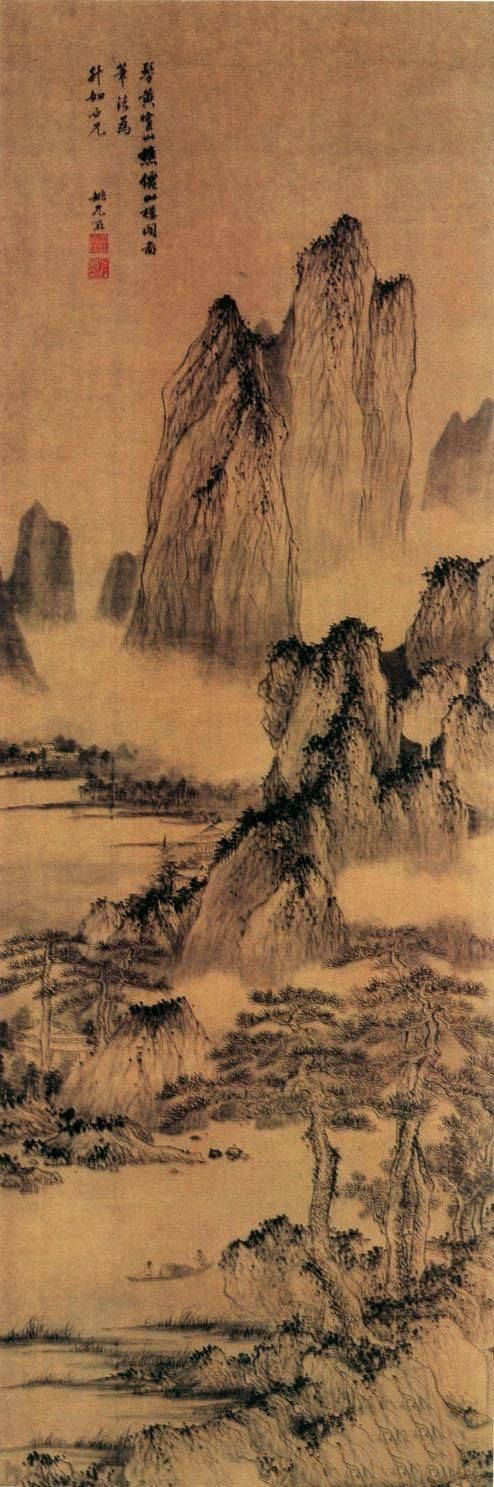 姚允在《仙山楼阁图》简介:绢本,立轴,墨笔;纵147.5厘米,横51.4厘米;藏于天津艺术博物馆。