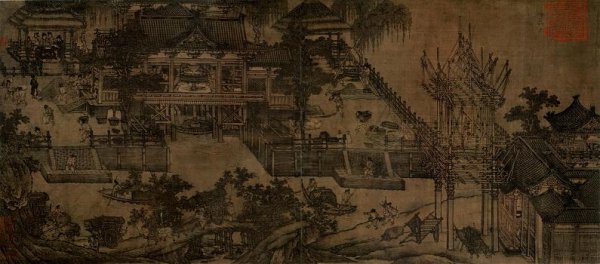 卫贤简介:生卒年不详,五代南唐画家。长安(今陕西西安)人。仕后主时为内供奉。初师尹继昭,后宗吴体(道子)。善界画,既能“折算无差”,又无庸俗匠气,被称为唐以来第一能手。以楼观、殿字、人物及山村、盘车、水磨见胜于当时。传世作品有《高士图》和《闸口盘车图》。
