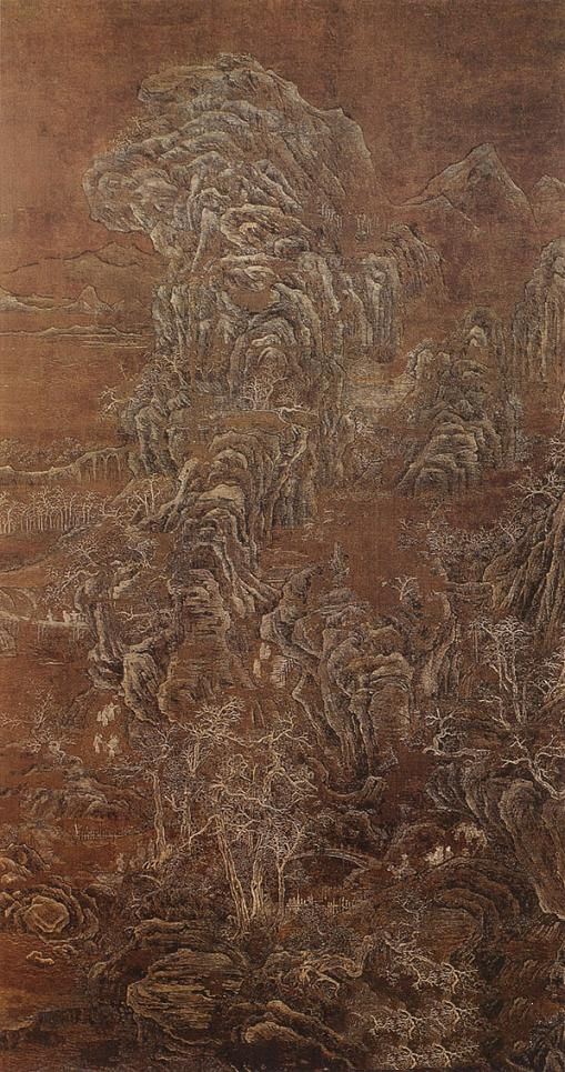 《雪景山水图》:这件作品相传是古墓中出土,整幅作品以立幅构图,画重重山峦,其间有行旅人物点缀,山形屈曲,设色浓重。画法以秃笔细写,形如古隶,苍古之甚。整幅画面以墨取韵,以笔取其山水的大体结构得其阳刚之美,以墨渲染见其仪姿得其阴柔之美。是荆浩传世名画之一。