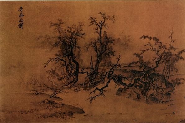 《芳春雨霁图》:这件作品描绘的是荒野的小溪,石头和几株稀稀落落的老树。枝上嫩叶初露,春意浓郁。远方烟霭出没,隐约可见。画中怪石用山斧劈皴,老树用严谨的双钩填墨法,树叶用淡褐色点染。全图用笔瘦硬劲峭,构图简括,画风学马远而又有自己的创新,是马麟山水画的经典作品。