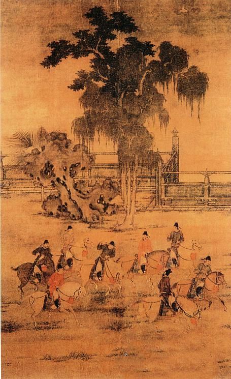 《八达春游图》:这是赵 的代表作之一,描写的是八个人骑马春游的场景,他们以中间一人为主体,相互招呼着、顾盼着。环境似一苑林,有假山石、曲栏环抱,垂柳依依。画面空阔,人物情态轻松自如,与踏青游观的画题相符。画家非常注意区别每个人物与马匹的姿态动势,正、侧、向、背,各不相同。马匹错落有致,富于松紧疏密的变化,使得整个画面活泼生动,人物与马匹都以细劲的线条钩勒,流畅舒展。“八达”,有人认为是指八人,具体指哪八个人,现在已经无法考证。