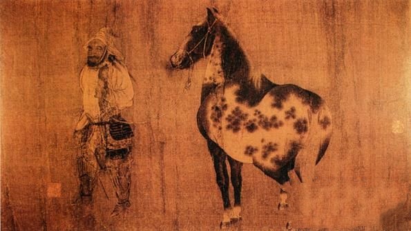 《调马图》:这件作品描绘的是画面描绘一马夫牵马在漫步。他头戴卷檐帽,身穿窄袖胡服,高鼻深目、满腮胡须,可以看出是位西域骑者。马取斜侧面,白地墨花、雄健强壮,大有跃跃欲行之状,是一幅非常生动的作品。整幅画以淡墨勾线,简劲古朴,微有波磔,马体的色墨渲染,恰如其分地表现了肌肉的起伏,看上去肥健而有体积感。